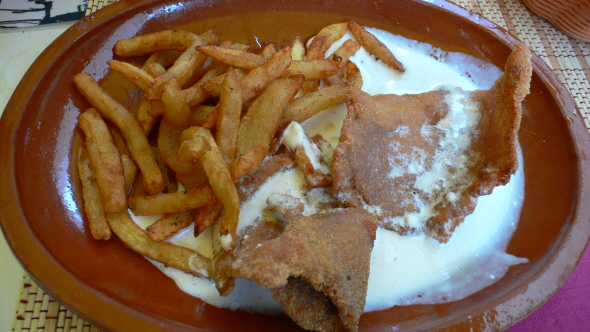 Meal of the day ‘Menu del Dia’ is lunchtime, affordable food. It is a requirement that restaurants must offer two or even three ‘plates’ or servings at this time of day. These meals cost the equivalent of £10 or less per person. I had a two plate Menu del Dia as follows, Gaspacho soup followed by fried pigs ears and ‘chips’.