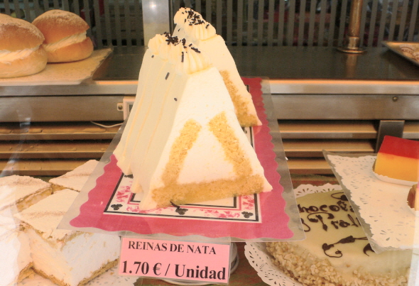 I decided my postas could be later in the day when I would choose from the glorious range of cakes and pastries on offer in the high street shops. The’ Pasteleria’ is where you purchase cakes and the ‘Panaderia’ for breads. You might find ‘Mugis’ that are rather similar to pain- au-raisin with toasted almonds, ‘Ensaimada’ with crystalised fruits or ‘Tortel de Hojaidre’ like doughnuts with a sugar icing glaze and toasted almonds. The use of marshmallow is evident to provide that rich luxurious layering that will withstand the summer heat. A triangular creation sold in portions appeared to celebrate new arrivals and was called ‘Reinas de nata.’