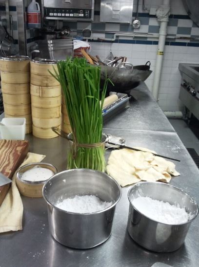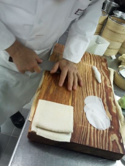 Paper liners in the traditional wooden steamers waited for our hand-made pale green and white dim sum. They were covered and placed on the steamer.