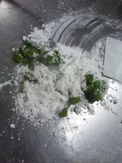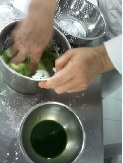 The dough was made by working in the boiling water (by hand!) and enough green juice for half the dough to be green dough.