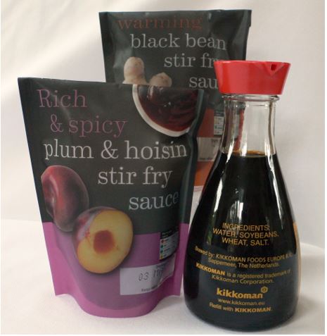 Soy sauce is fermented from soya beans to become either paler runny soy sauce or with added sugar syrup to make thick and sticky soy sauce.