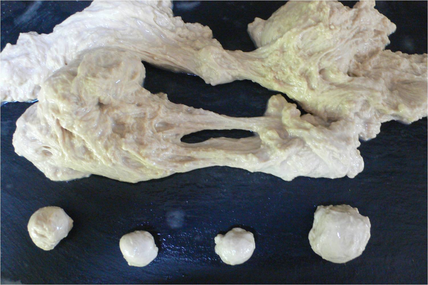 The dough formed can be ‘washed’ in cold water to remove the starch. The starch grains are suspended in the water and wash away as white milky water. Gradually the gluten can be seen as a grey, stretchy mass. The more starch is removed the stronger and more elastic the remaining gluten. You can cook small portions of the gluten. On heating any remaining water turns to steam and puffs up the gluten. The outer crust of gluten sets as the proteins are denatured by the heat. It takes longer for the inside to set. The structure will collapse after cooking as steam softens the crust.
