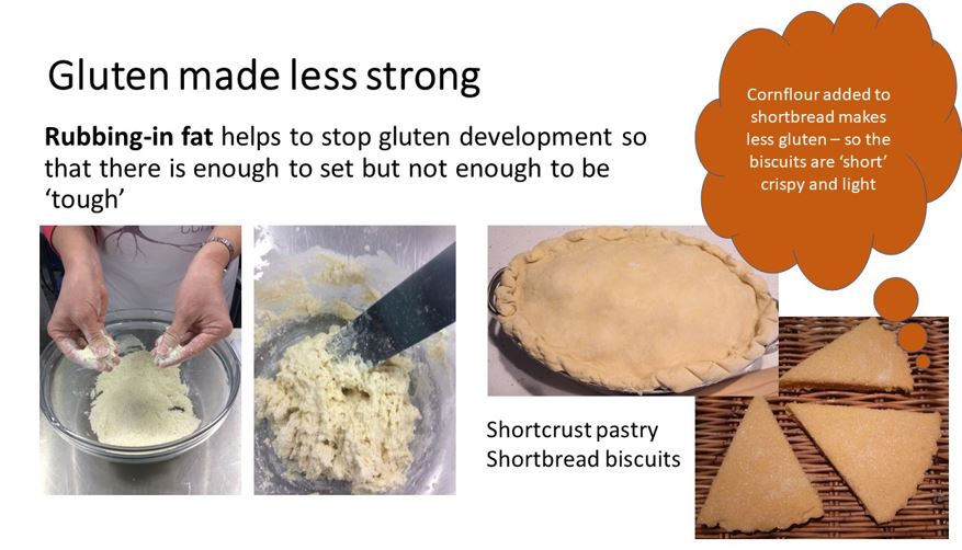 When you prepare shortcrust pastry or shortbread the reverse is seen. The gluten is not required to be ‘developed’, in fact it is the action of rubbing in fat that prevents water long strands of gluten forming and keeps the pastry or biscuits crumbly and light in texture.