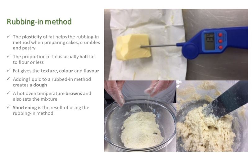 The rubbing-in method is a basic to learn, and it relies on the plasticity of fat to coat the flour grains as you prepare the recipe. Plasticity is the ability of fat to melt over a range of temperature. Yellow block baking fat is best to use and leaving it out of the refrigerator for a little while before rubbing-in helps it to perform best. The proportion of fat is important as it changes the texture and flavour profile of the end product. The image below shows experiments with different fat combinations.