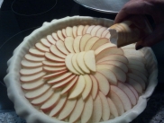 Level out the stewed apple and layer the sliced apples pieces round the flan