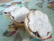 Pastry:250g Plain white flour130g butterWaterFilling:100g currants50g dried cranberriesPinch ground cinnamon1 lemon and juiceI jar mince meat2 eating apples – Cox’s orange pippins or similar20g sugarTopping:Icing sugar for serving