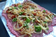 Prep: Place mince on the baking parchment and cover with a second sheet.