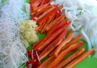 Cooks Know How: Chicken breast is low in fat and high in protein. If it is sliced thinly it can be cooked quickly but it needs some oil to help retain moisture and tenderness. Make sure all the chicken changes colour to white. Flavours from the garlic, ginger and chilli will easily be absorbed by the chicken. Colour is added by the use of vegetable, in this case the red pepper. Because the cooking is rapid all the ingredients must be very finely sliced. Once the ingredients are in the pan they need to be stirred to prevent browning on the pan base and ensure the heat is distributed and cooks everything through. Fine rice noodles are a good choice for adding to a stir-fry because they are made from rice flour and quickly reheat. They are gluten free and therefore this dish is suitable for people who have Coeliac dietary requirements.